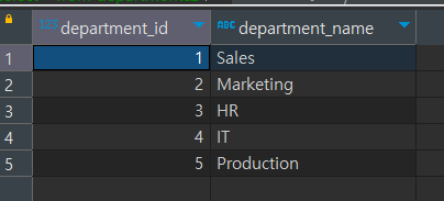('Sales'), ('Marketing'), ('HR'), ('IT'), ('Production');