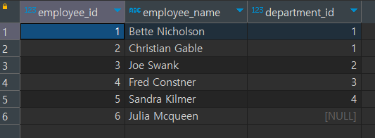 위의 두 개의 테이블을 잘 기억해 주시기 바랍니다. 일단 위의 부서 현황과 임직원 리스트를 보면, 두 가지 특징이 있습니다. 우선 직원 중 6번 Julia Mcqueen의 할당된 부서 ID가 없습니다. 또한, 부서 중 'Production' 부서에 소속된 임직원이 없습니다.