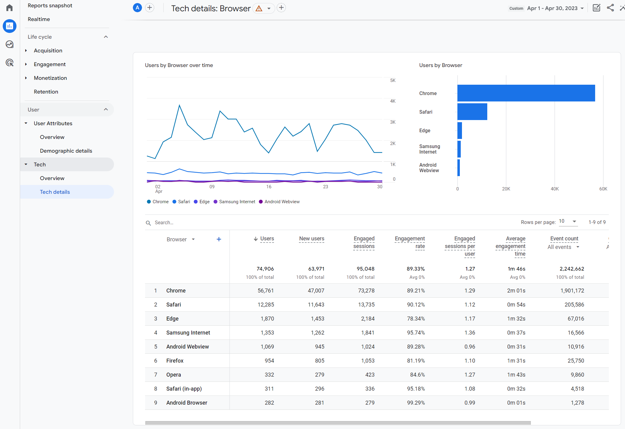 지금 해당 [기술 세부정보(Tech Details)]로 진입했을 때, 하단의 테이블에 적용된 측정 기준(Dimensions)은 무엇인가요? 현재는 '브라우저(Browser)'로 설정되어 있습니다. 크롬, 사파리, 엣지 등의 브라우저 종류를 의미하겠죠.