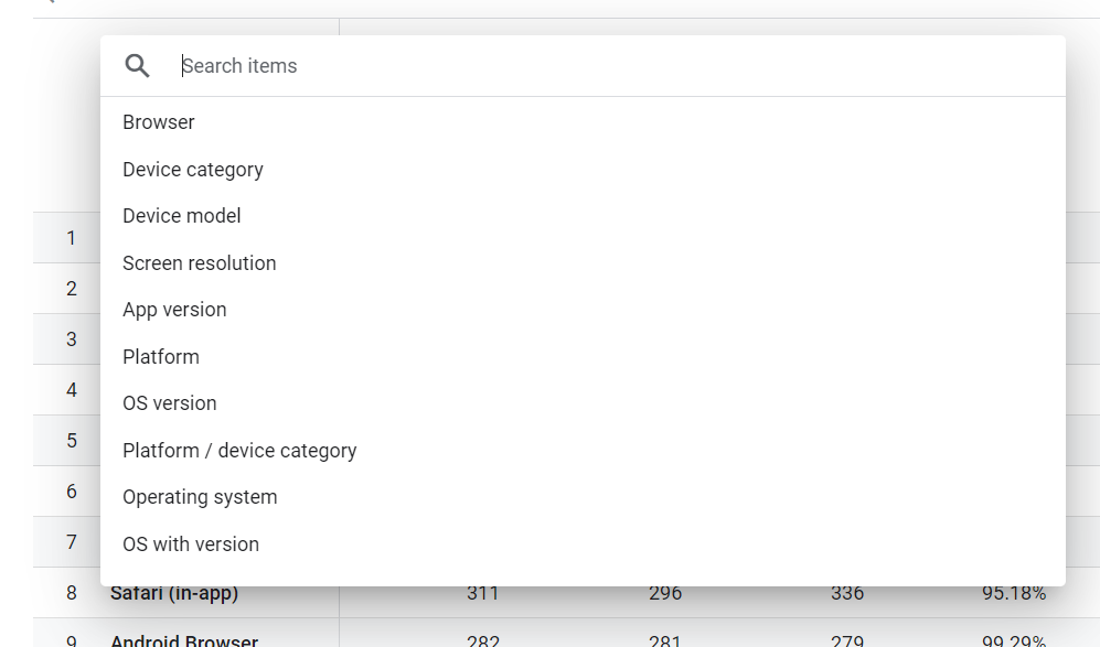 반대로 측정 기준(Dimensions)를 클릭해 보겠습니다. 아래와 같이 브라우저, 화면 해상도, 앱 버전 등의 측정 기준 항목들을 확인할 수 있습니다.