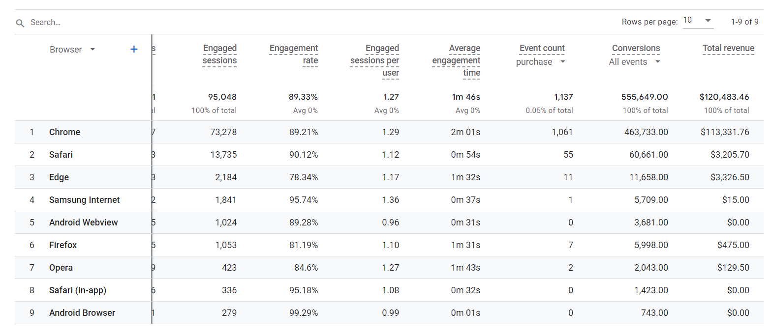 위 테이블에서 측정 항목(Metrics) 중에 '이벤트 수(Event Count)'를 선택해 보겠습니다. 여기서 이벤트 'purchase'를 선택해 주면, 각각의 브라우저에서 발생한 구매 이벤트 건수를 확인할 수 있겠죠. 역시, "크롬에서 가장 많은 구매가 일어난다"는 사실을 확인할 수 있습니다. 참고로 화면의 0.05% of total(총계 대비 0.05%)라는 의미는, 전체 이벤트 중 purchase 이벤트가 발생한 비율을 의미합니다.