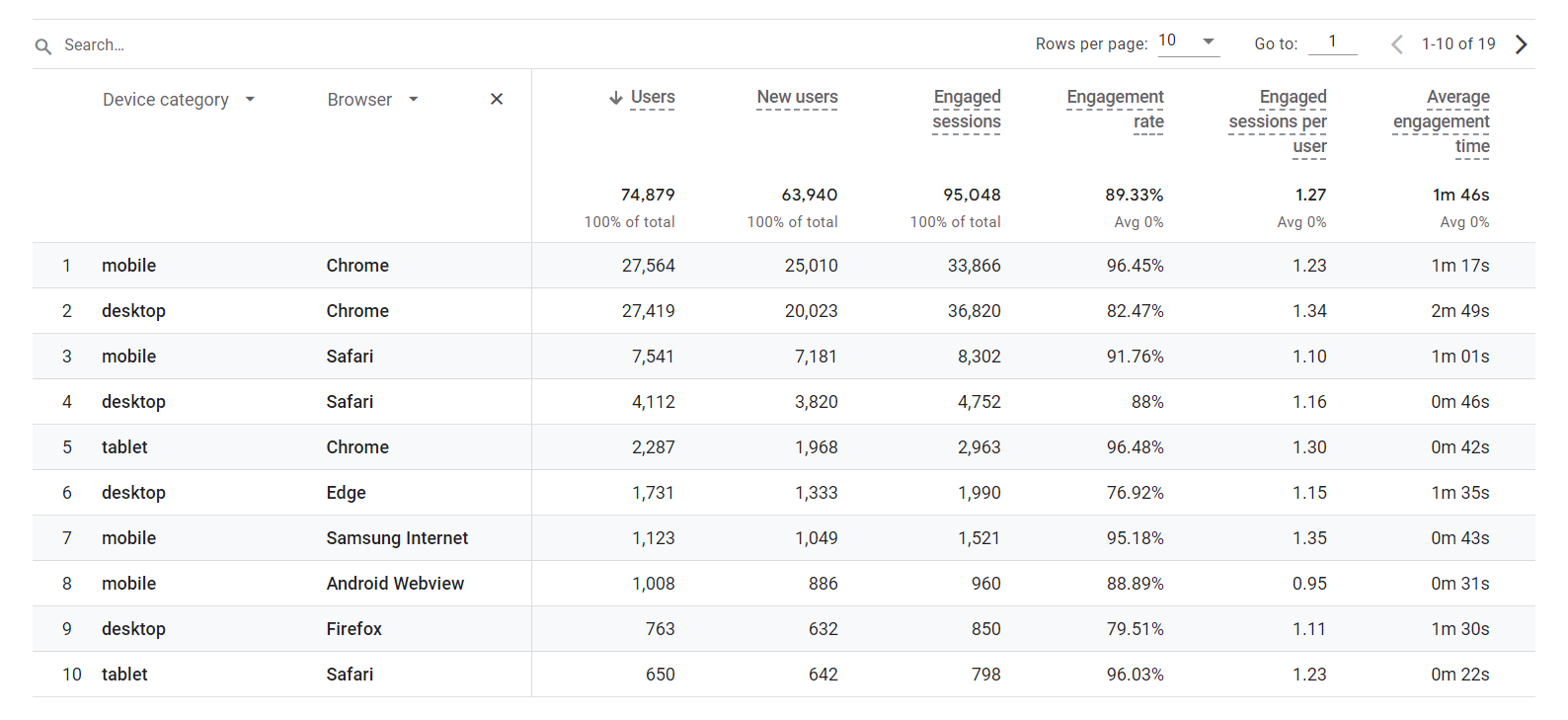 여기서는 예시로 브라우저(Browser)를 추가했습니다. 여기서 2차원 리포트를 통해 좀 더 세부적인 데이터를 확인할 수 있게 됩니다. 참고로 3차원 이상의 리포트는 이 표준 리포트(Reports) 메뉴에서는 생성할 수 없습니다. 향후 배울 탐색 리포트(Explore)메뉴에서 확인할 수 있습니다.