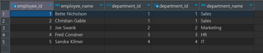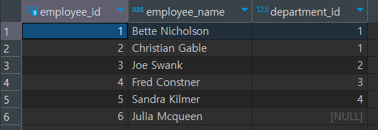 만일 쿼리에서 두 테이블의 위치를 바꾸어준다면, DEPARTMENT_ID는 여전히 가장 앞에 나오고 그 다음 DEPARTMENT_NAME, EMPLOYEE_ID, EMPLOYEE_NAME 순서대로 출력이 됩니다.