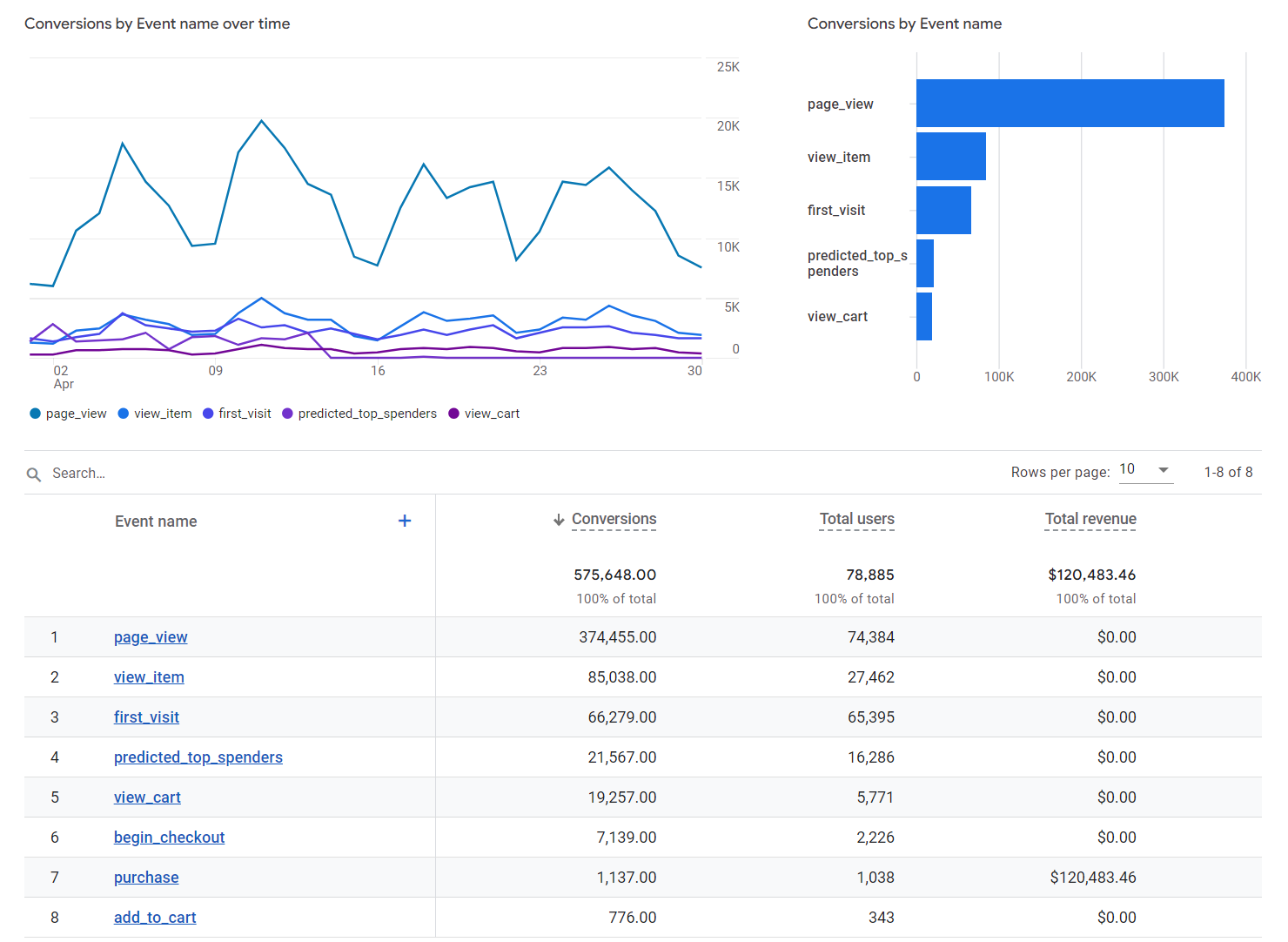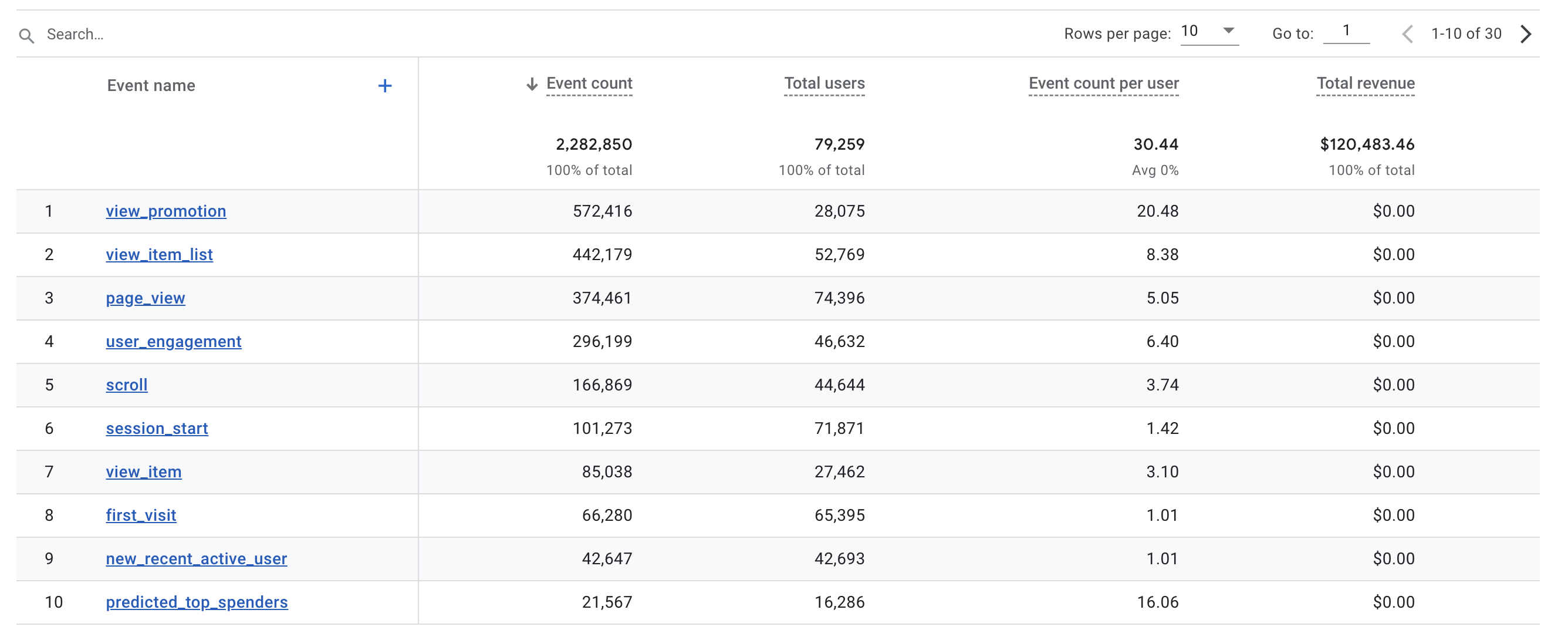 1번 [view_promotion] 이벤트를 예시로 살펴볼까요? 572,416회의 이벤트가 집계되었는데, 총 사용자는 28,075명입니다. 즉 유저 1명이 20.48회의 이벤트를 일으켰습니다(광고를 조회함).