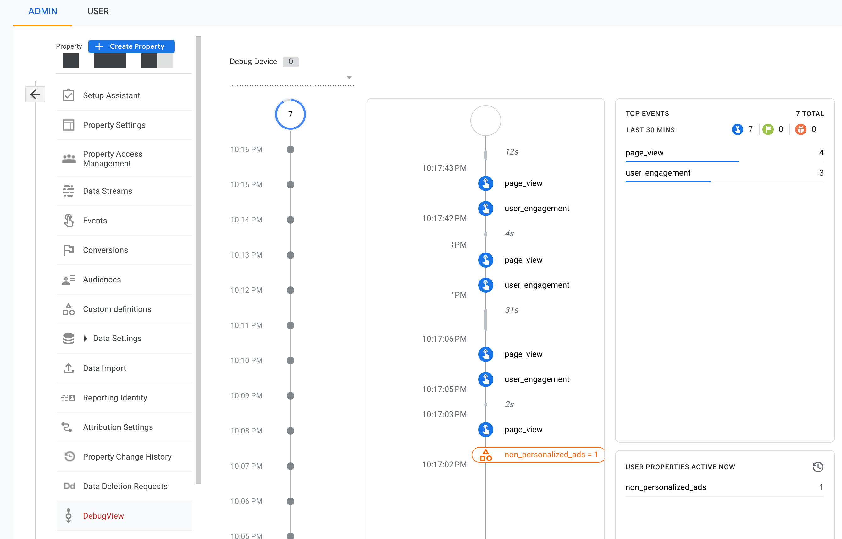 애널리틱스 설치 이후에, 해당 속성의 메뉴를 찾아보면 [DebugView] 메뉴가 있습니다. GA4에서 디버그 뷰의 용도는 무엇일까요? 다름 아닌 추적코드 또는 이벤트 설치 이후에, 이러한 값들이 정상적으로 전달되고 있는지를 확인하는 목적으로 사용하게 됩니다.