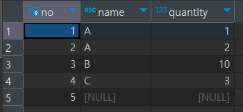 NAME을 기준으로 그룹을 만들었기 때문에 SELECT에서 NAME은 그대로 사용했습니다. 단, QUANTITY의 경우 각 그룹 별로 수량을 모두 합산한 값을 산출하도록 SUM( )을 사용하였습니다. NO열의 경우에는 임의로 '가장 작은 NO 값'을 표시하도록 MIN( ) 집계 함수를 사용하였습니다. 즉, NO와 QUANTITY 모두 '하나의 값'이 리턴되도록 집계함수를 사용한 것입니다.