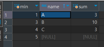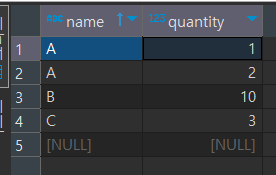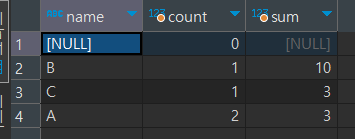 위와 같이 QUANTITY 열은 집계함수를 사용하거나 GROUP BY에서 선언된 열이어야 합니다. 자, 그럼 왜 오류가 생기는지 짚어볼까요? 우선 GROUP BY에서 NAME을 기준으로 그룹을 만들도록 선언했고 SELECT에선 NAME을 지정했습니다. 그래서 위와 같이 A, B, C, [NULL]이라는 그룹이 만들어졌습니다.
