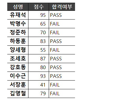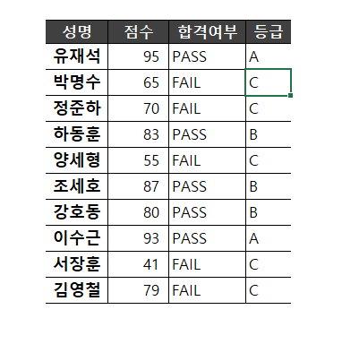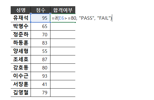 기존 IF문에서 [value_if_false] 영역이 IF로 좀 더 구체화된 케이스라고 생각하면 됩니다. 자, 바로 예제로 테스트해보겠습니다. 우리는 위의 점수 판단 기준에서 80점 이상이면 통과라는 기준으로 PASS와 FAIL을 판단했습니다.