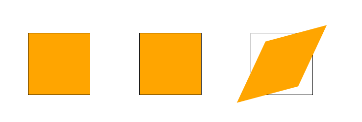 skew( ) 함수를 사용하게 되면, 설정한 각도만큼 요소를 비틀어 줍니다. 이 때 x축 또는 y축을 기준으로 비틀게 되는데, x축의 경우 양수일 경우 x축을 기준으로 좌측으로 당겨 비틀게 됩니다. y축 값의 경우도 양수일 경우에는 좌측을 y축 기준으로 당겨서 비트는 형태가 됩니다.