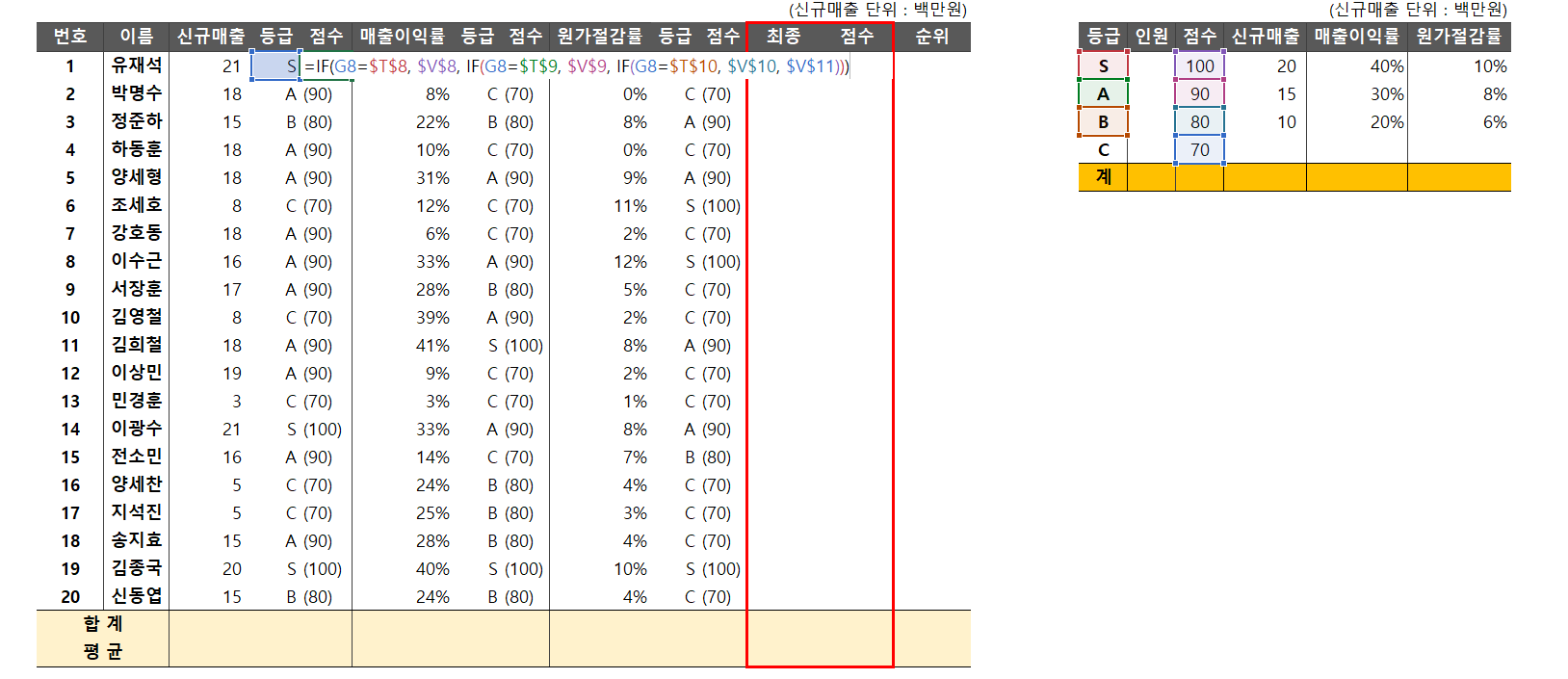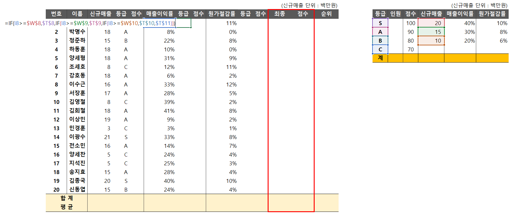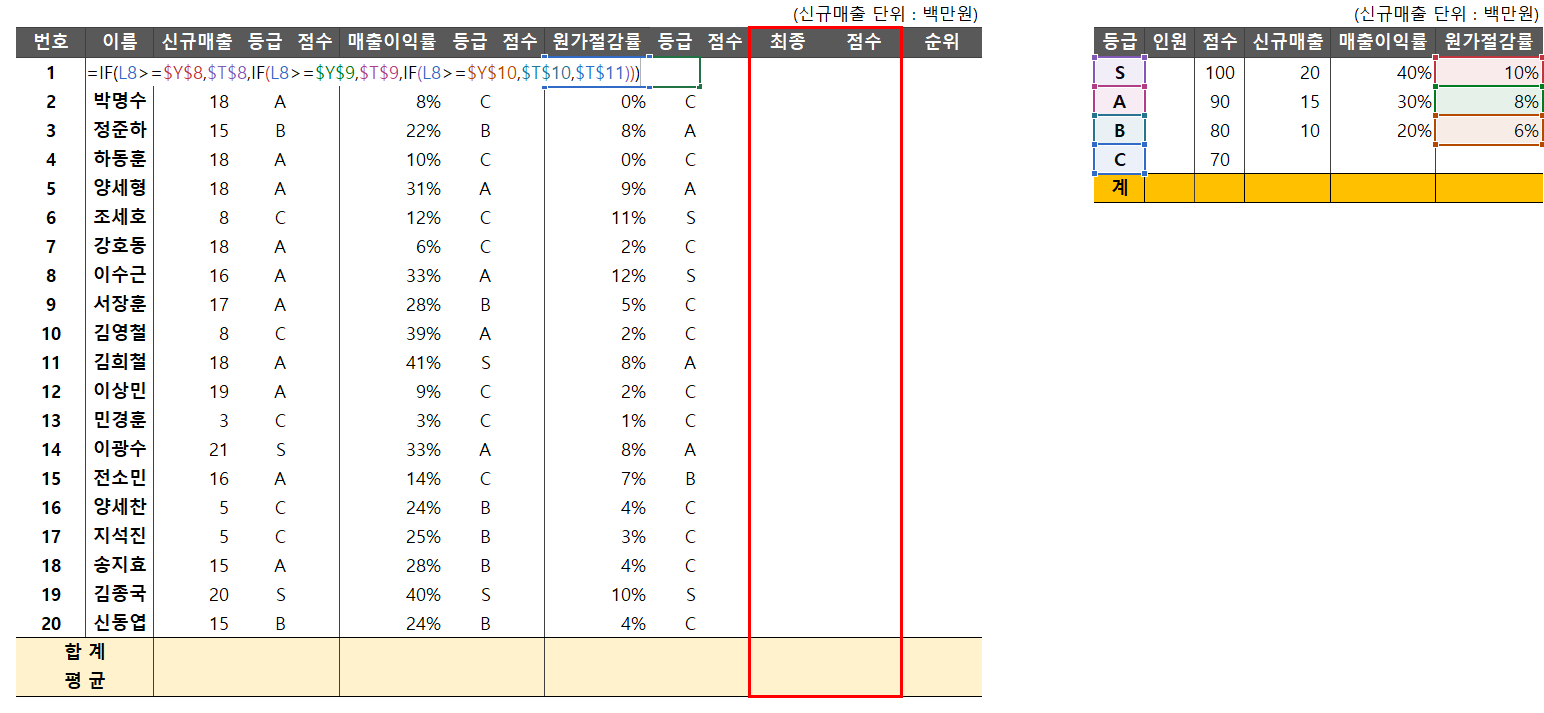 위와 같이, 개개인이 발생시킨 신규 매출 금액을 기준으로 IF를 통해서 등급을 매겨두었습니다. 이제, 이와 동일한 방식으로 카운트하는 매출 이익률 평가와 원가 절감률 평가도 함께 진행해 보겠습니다.