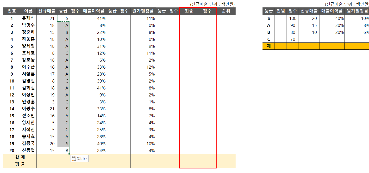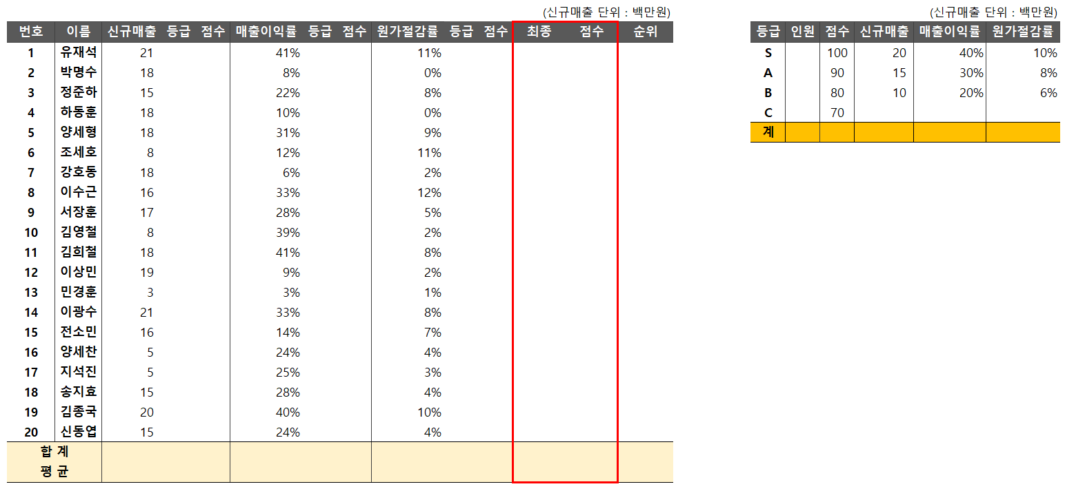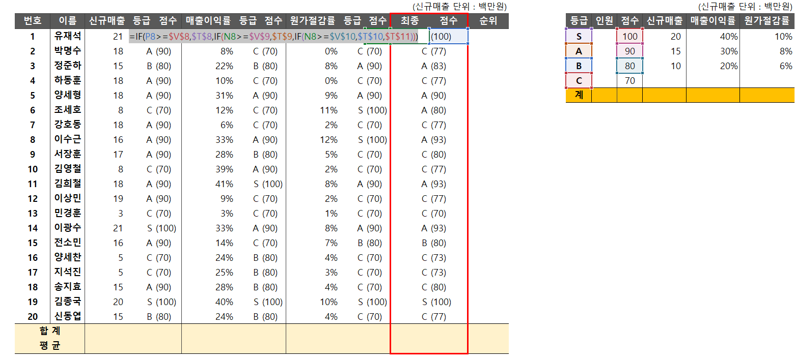 위와 같이, 개개인이 발생시킨 신규 매출 금액을 기준으로 IF를 통해서 등급을 매겨두었습니다. 이제, 이와 동일한 방식으로 카운트하는 매출 이익률 평가와 원가 절감률 평가도 함께 진행해 보겠습니다.