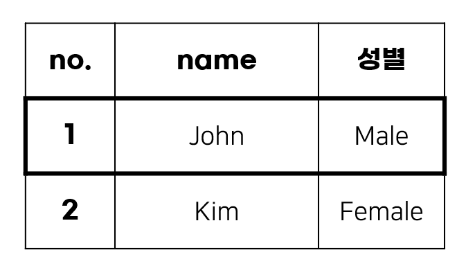 위와 같이 John이라는 데이터 요소 행 하나가 하나의 집합에서의 요소이며, 각각 no.와 name, 성별이라는 속성(열)을 갖는 구조이죠.