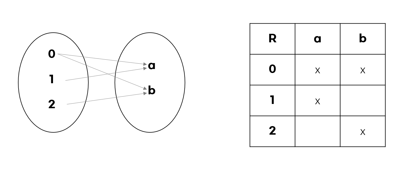 위의 그림과 같이 하나의 관계 'R'을 화살표 선도와 표를 통해서 다양하게 표현할 수 있습니다. 행렬도 관계 표현 방식중의 하나입니다.