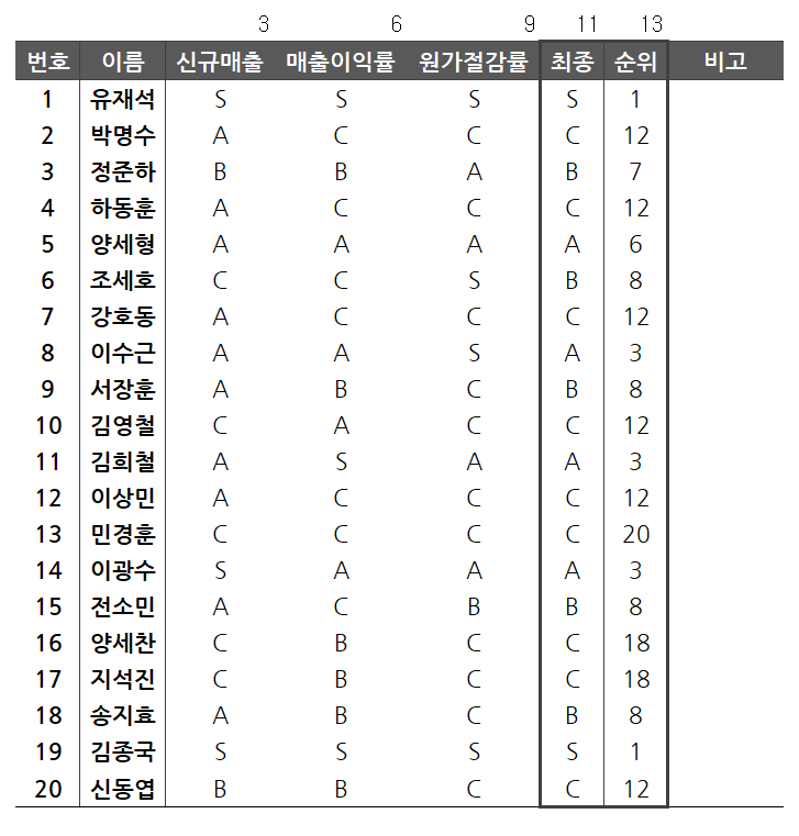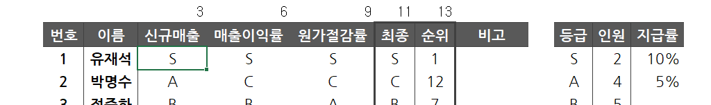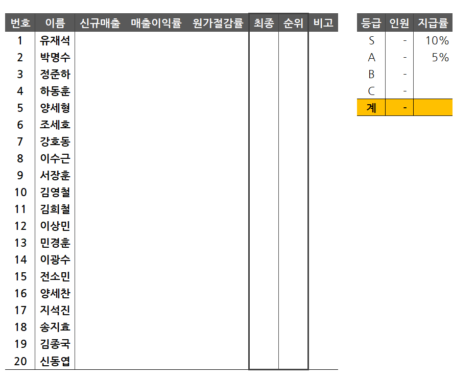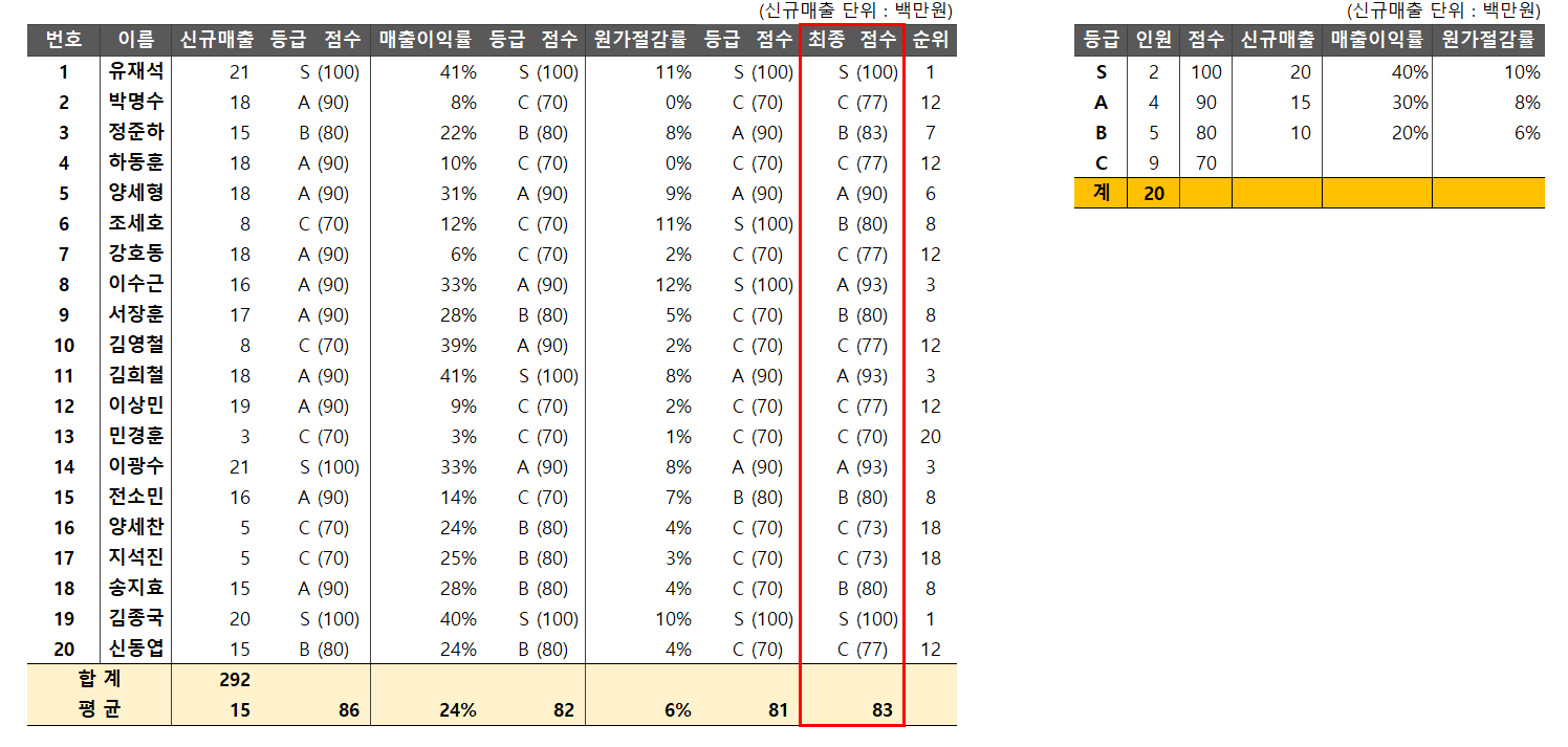 우선 raw data에서 상부 보고 자료로 사용할 결과 요약 문서에는 임직원 개개인의 매출 등급, 매출 이익률 등급, 원가 절감률 등급을 보여주고 종합 등급과 순위만을 보여주려고 합니다. 그리고 결과적으로는 각각의 등급은 몇 명씩 분포하는지도 보여주고자 합니다.