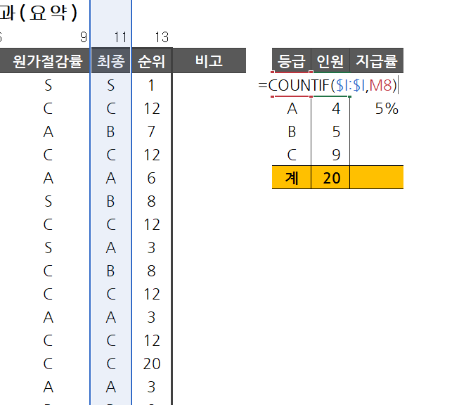 각 등급별 인원 수 카운팅은, 아래와 같이 COUNTIF를 사용합니다. 범위, 카운트 대상의 순서로 파라미터를 작성하면 됩니다.
