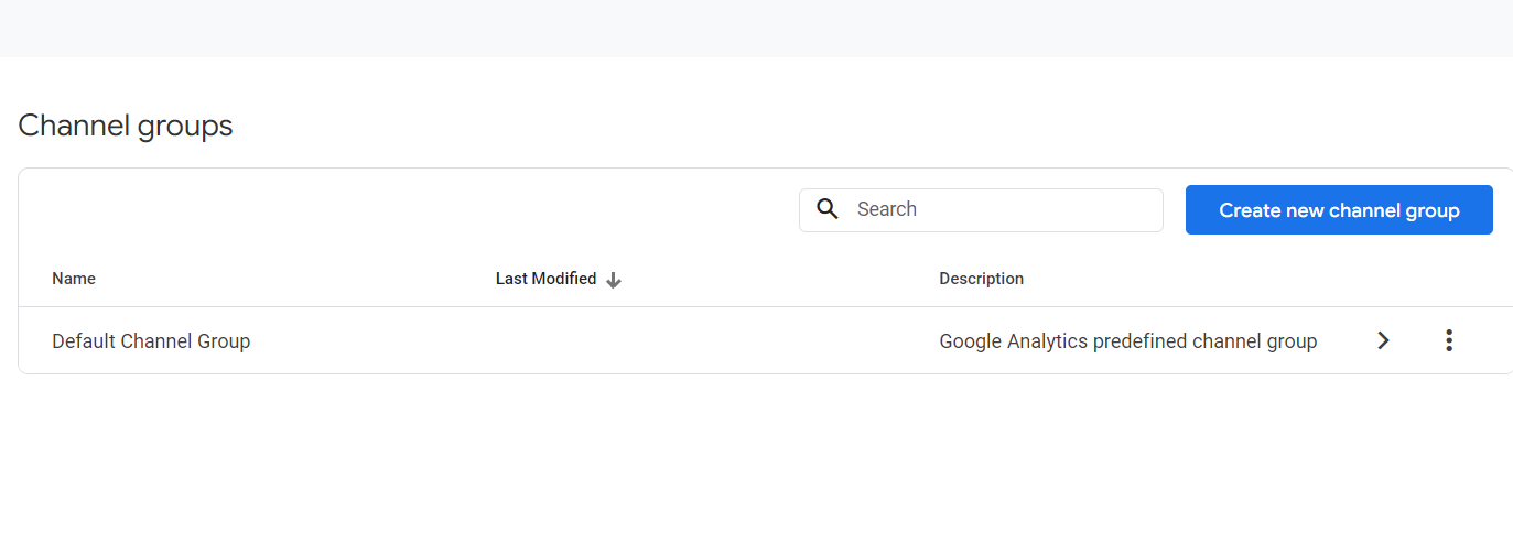 우리가 앞선 아티클에서 알아봤던 채널 명에 대한 리스트가 작성되어 있습니다. 참고로 GA4에서 기본으로 제공하는 내역이기 때문에 수정도 불가능한 속성입니다. 그럼 이제 이것과는 별개로 우리가 직접 정의하는 채널 그룹들을 생성해 보도록 하겠습니다. 아래 이미지와 같이, [Create new channel group]을 클릭해 봅시다.