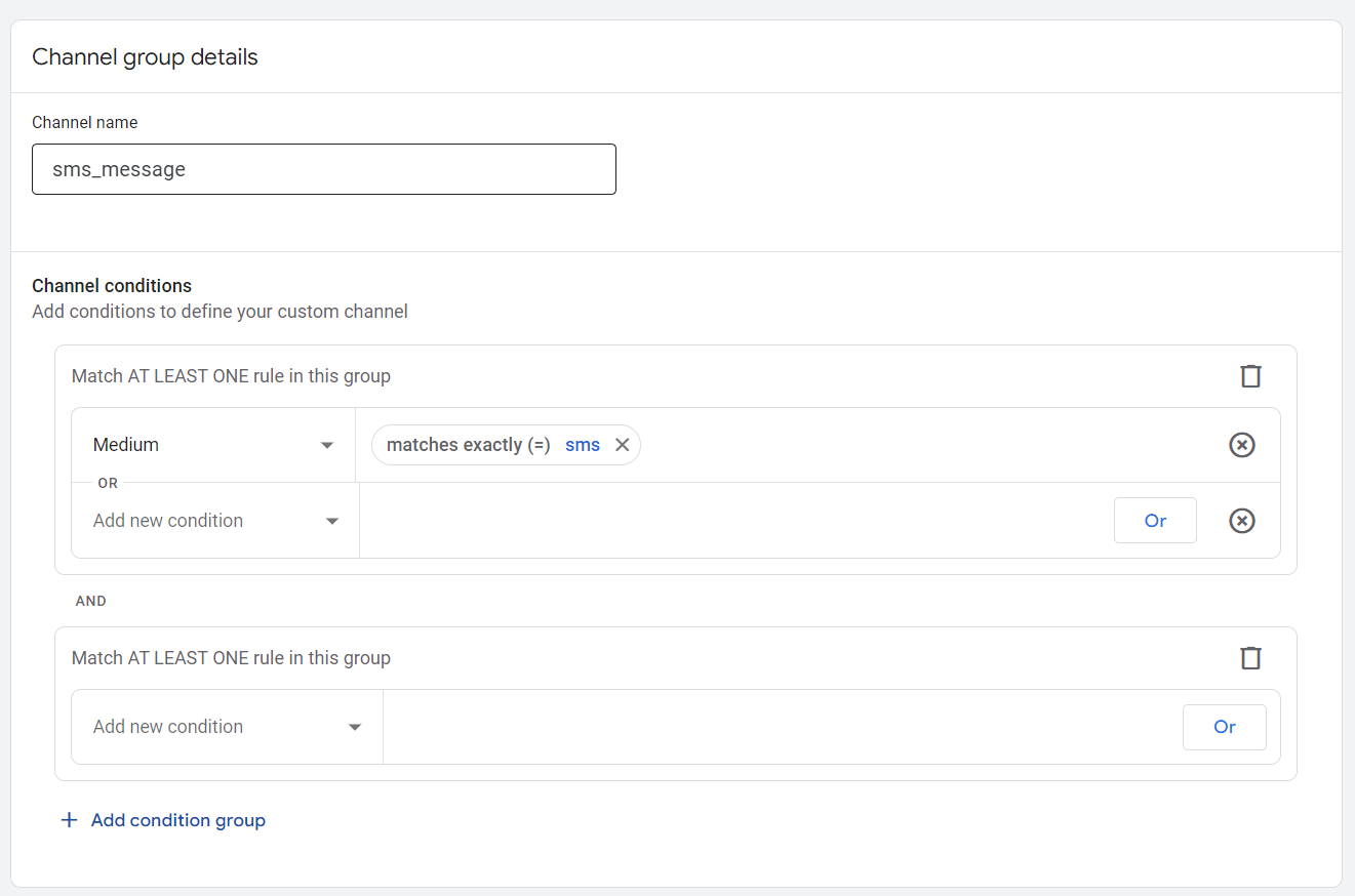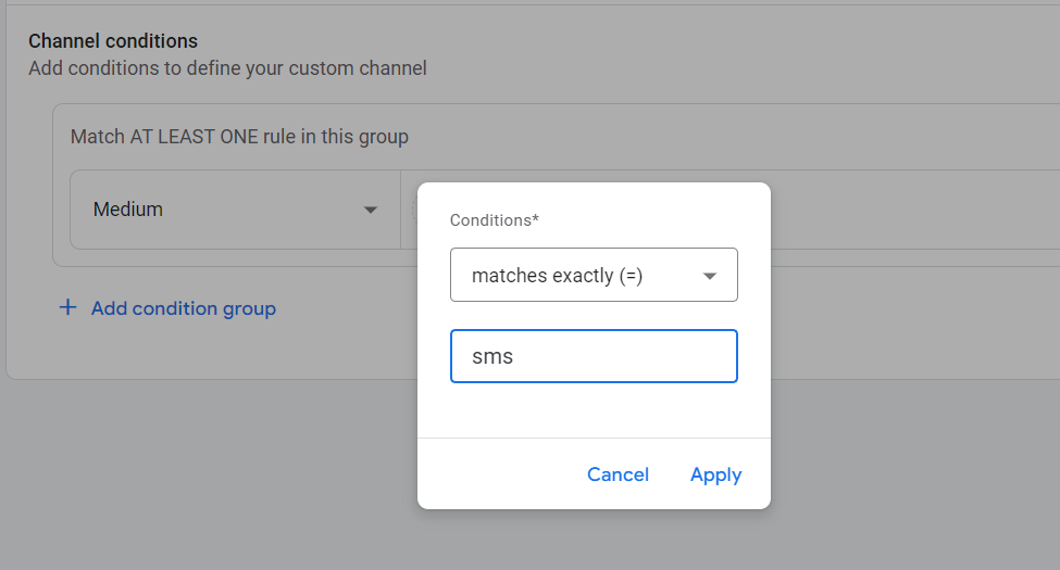 Channel name에 우리가 앞으로 사용할 채널 명을 정의하고, 해당 채널 분류 조건을 Channel conditions를 통해서 정의할 수 있습니다. 역시 여기서도 Medium, Source, Campaign ID 등의 조건을 지정할 수 있습니다. 예를 들어서 여기서는 우리가 medium을 sms로 보냈을 경우에 해당한다고 가정하면, 아래와 같이 입력합니다.