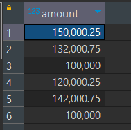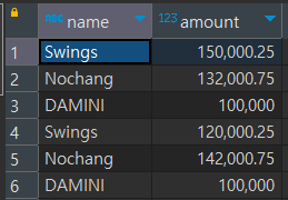 아래와 같이 특정 칼럼만을 지정해서 사용하는 것도 당연히 가능합니다. NAME, AMOUNT만 각각 사용해 보겠습니다.