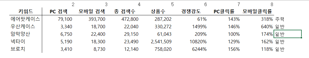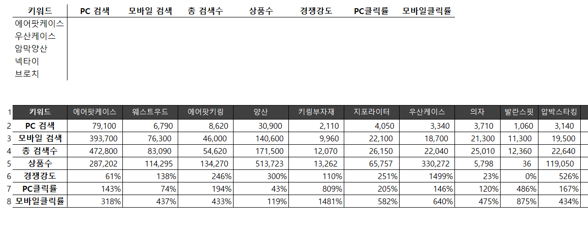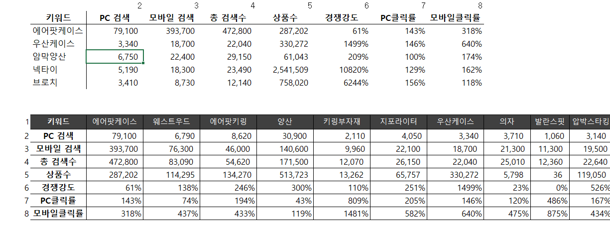 위의 데이터를 보시면, 키워드 중 에어팟케이스 / 웨스트우드 / 에어팟키링 / 양산....과 같은 첫 번째 행의 데이터 분류가 각각의 데이터입니다. 새로운 상품이나 키워드가 추가되면 새로운 열이 추가되겠죠. 그리고 각 상품이 갖는 검색 수 데이터는 각각의 상품에 대한 일종의 속성 역할을 하게 됩니다. 기존의 우리가 VLOOKUP으로 다루던 데이터가 정확히 반대로 피봇 되어 있는 상태를 보여주고 있습니다.