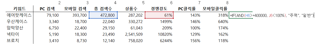 =IF(AND(H6>=400000, J6<100%), "주력", "일반")