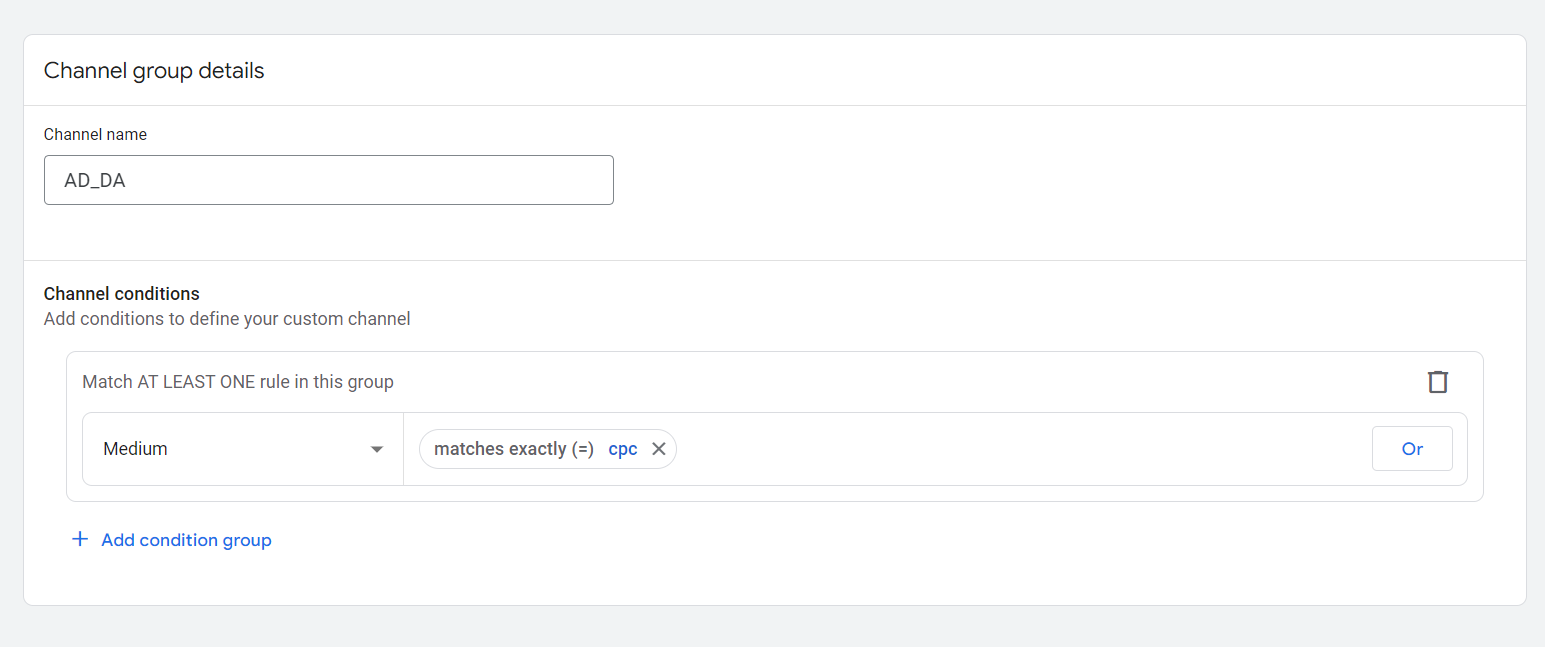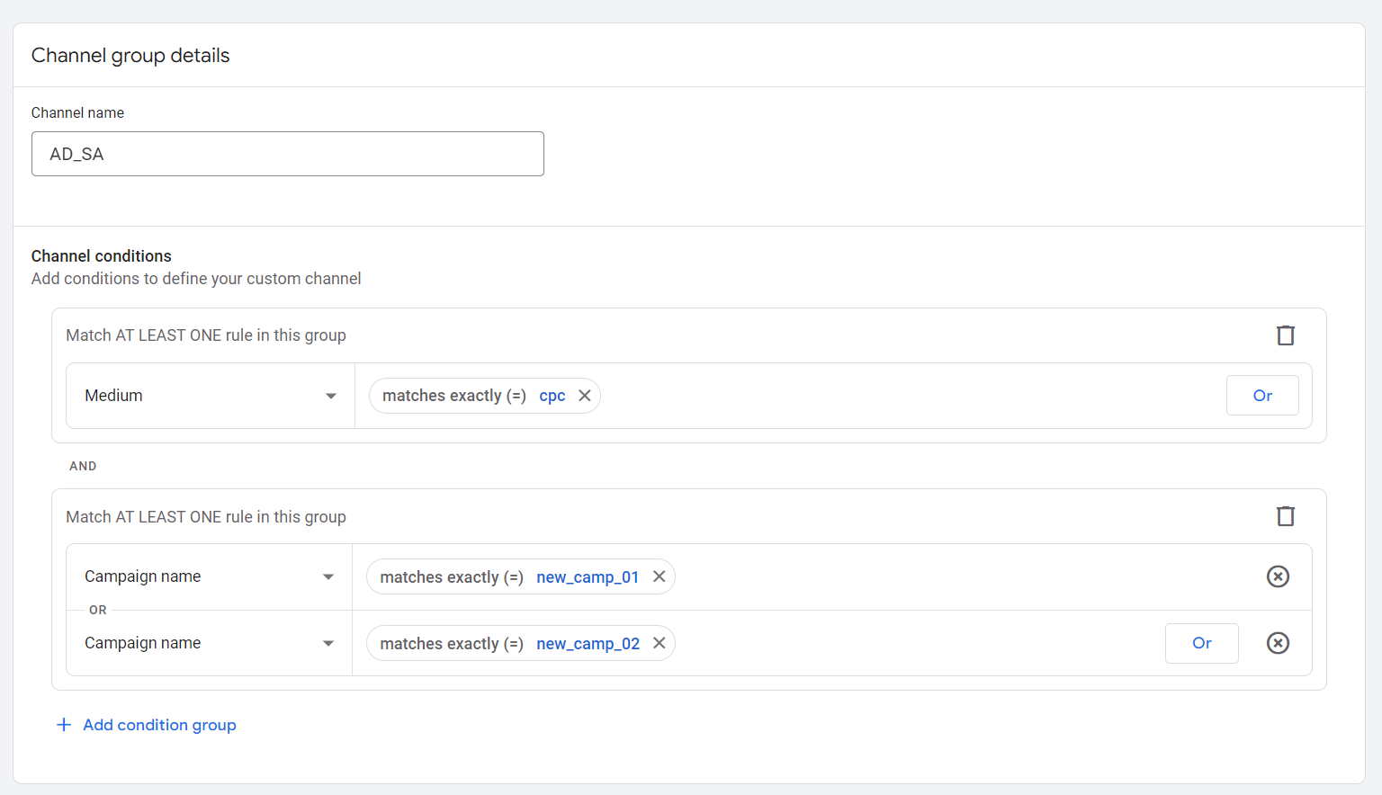 조건에 따라 [AD_DA], [AD_SA]로 구분하도록 설정해 두었습니다. 이제, 특별할 것은 없어 보이니 맞춤 채널 그룹에 두 개의 그룹을 조건에 맞춰 추가해 보겠습니다. [AD_DA]는 medium만 설정하면 되고, [AD_SA]의 경우 and 조건으로 campaign까지 설정해 주면 간단한 문제입니다.