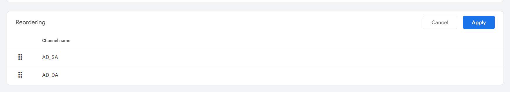 이러한 이슈를 해결하기 위해서는, Order를 조절해야 합니다. 특히 '조건이 상세한' 채널 구분을 상위로 올려야 하죠. 유입이 여기서는 [AD_SA]의 순서를 [AD_DA]의 위로 올려야 합니다. 채널 리스트의 [Reorder]를 이용해 순서를 바꾸어줍니다.