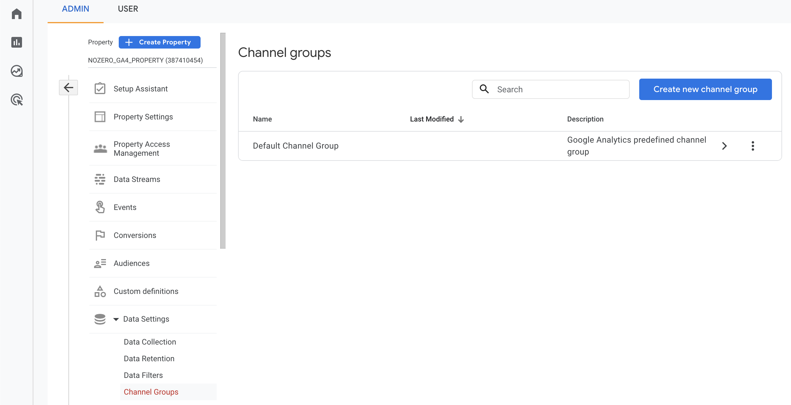 우선 기존 방식대로 [Admin] > [Data Settings] > [Channel Groups]로 이동하고, 여기서 [Create new channel group]을 클릭합니다. 그리고 여기에 사전에 등록되어 있는 Default Channel Group 요소들을 일단 모두 삭제해 줍니다.