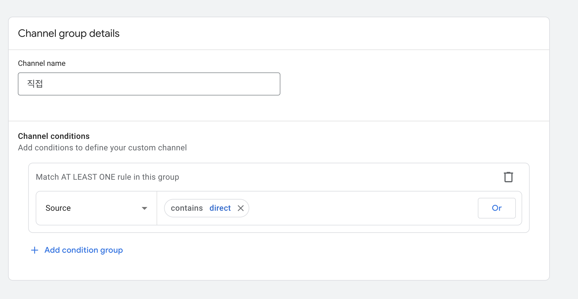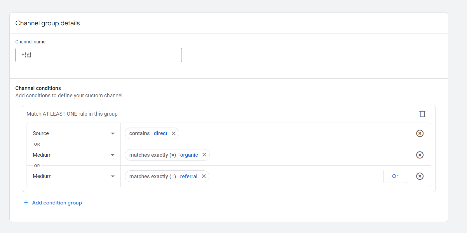 이 경우는 해당 Channel conditions의 조건에 Or 추가를 통해서 세 가지 조건에 or로 부합할 경우 '직접'으로 채널을 분류하도록 설정한 것입니다.