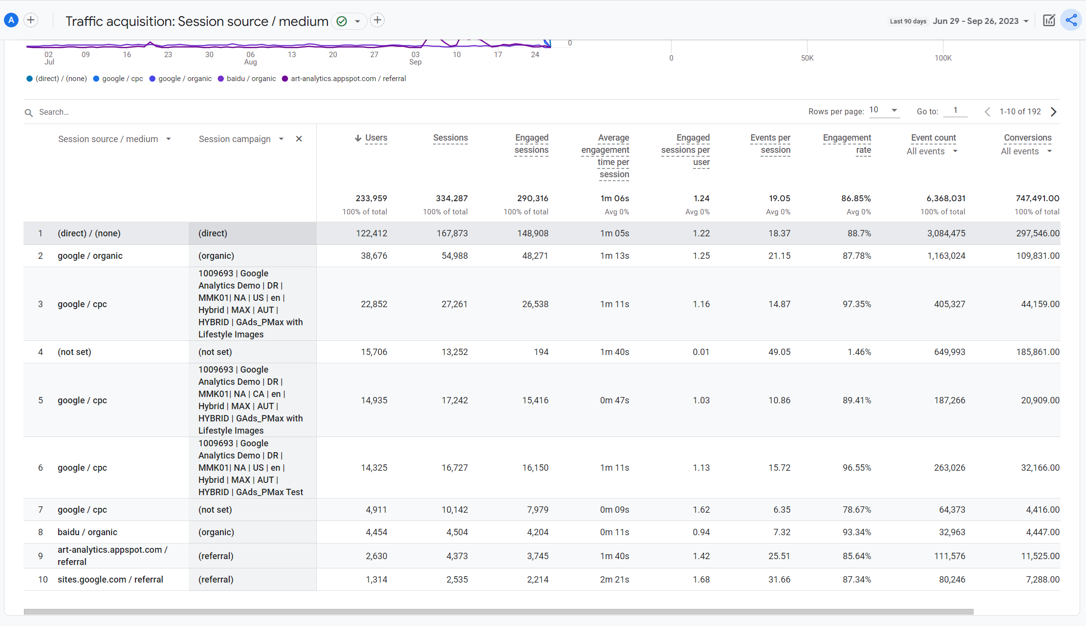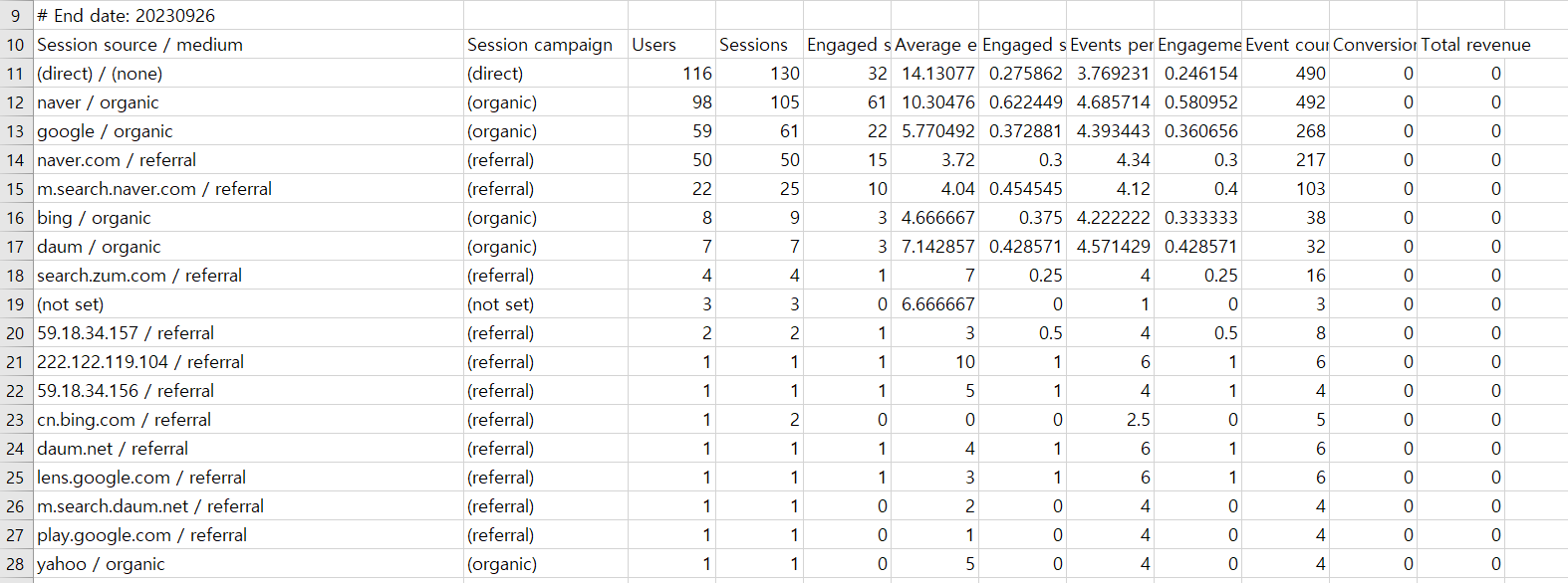* 처음부터 특정 서비스의 맞춤 채널을 설정하는 것은 매우 어려운 일입니다. 이를 조금이라도 쉽게 진행하려면, 다음과 같은 방법을 사용해 봅시다. 우선 Traffic acquisition을 기준으로 보면, 최근 약 3개월 정도의 유입 데이터를 확인하고, 아래와 같이 측정 기준을 Session source / medium, 그리고 보조 측정 기준으로 Session campaign으로 설정한 후 이를 CSV로 다운로드합니다.