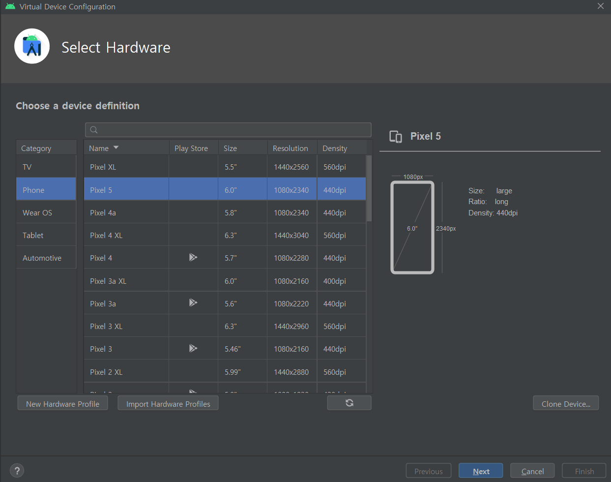 그리고 디바이스 종류를 선택해 줍니다. 여기서는 Pixel 5를 선택해 보았습니다.