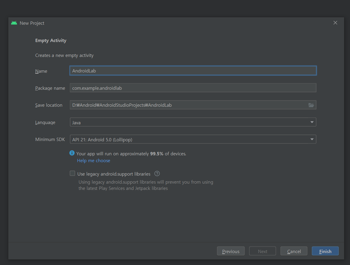 그리고 프로젝트의 속성들을 결정하게 됩니다. 일단, 프로젝트의 명칭은 [AndroidLab]으로 지정했고, Package Name도 지정합니다. 프로젝트 파일이 저장될 경로(location)도 지정하고 언어는 JAVA로 설정합니다. 원한다면 Kotlin이 선택 가능합니다.