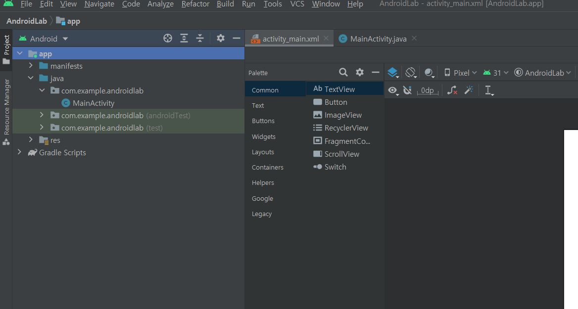 자, 이제 우리가 지정한 AndroidLab이라는 프로젝트 하위에, 자동으로 [app]이라는 모듈이 만들어졌습니다. 그리고 이 모듈에는 "Hello World!"를 출력하는 샘플이 구현되어 있죠. 현 단계에서는 이 프로젝트와 모듈의 레벨 구조 정도만 충분히 이해하고 있으면 됩니다.