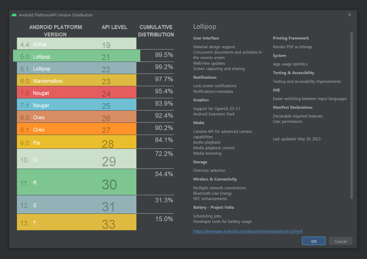 아래 OS 버전 별 점유율을 참고하여 지정합니다.