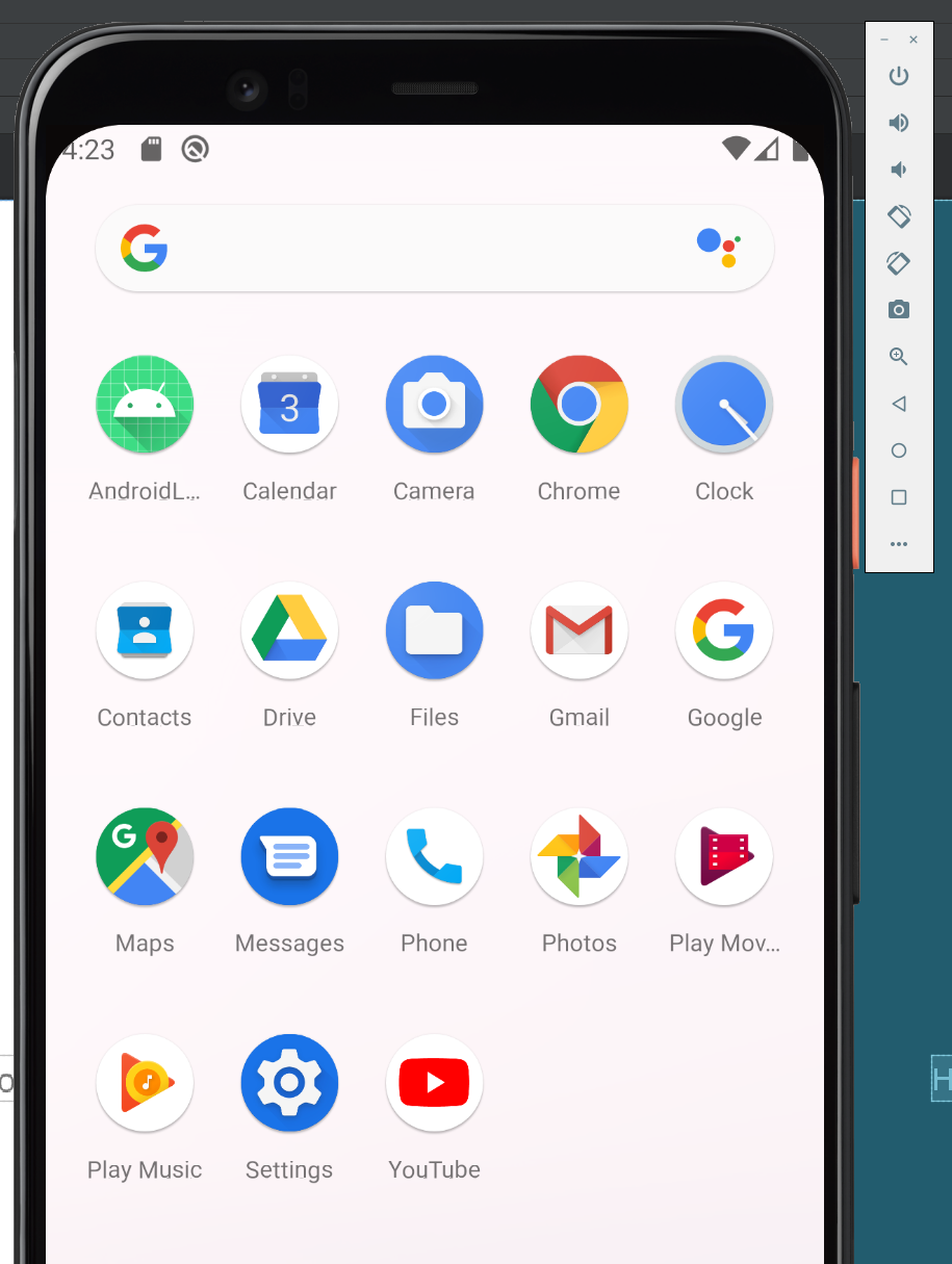 자, 이제 해당 프로젝트에서 우리가 저장한 AVD로 예제를 실행이 가능합니다. 왼쪽 [app]은 우리가 실행할 모듈(앱)을 의미하고 우측에 우리가 방금 만든 [Pixel 5 API 29]가 선택되어 있습니다. 우측의 실행 버튼을 클릭하면 아래와 같이 가상 디바이스가 실행됩니다.