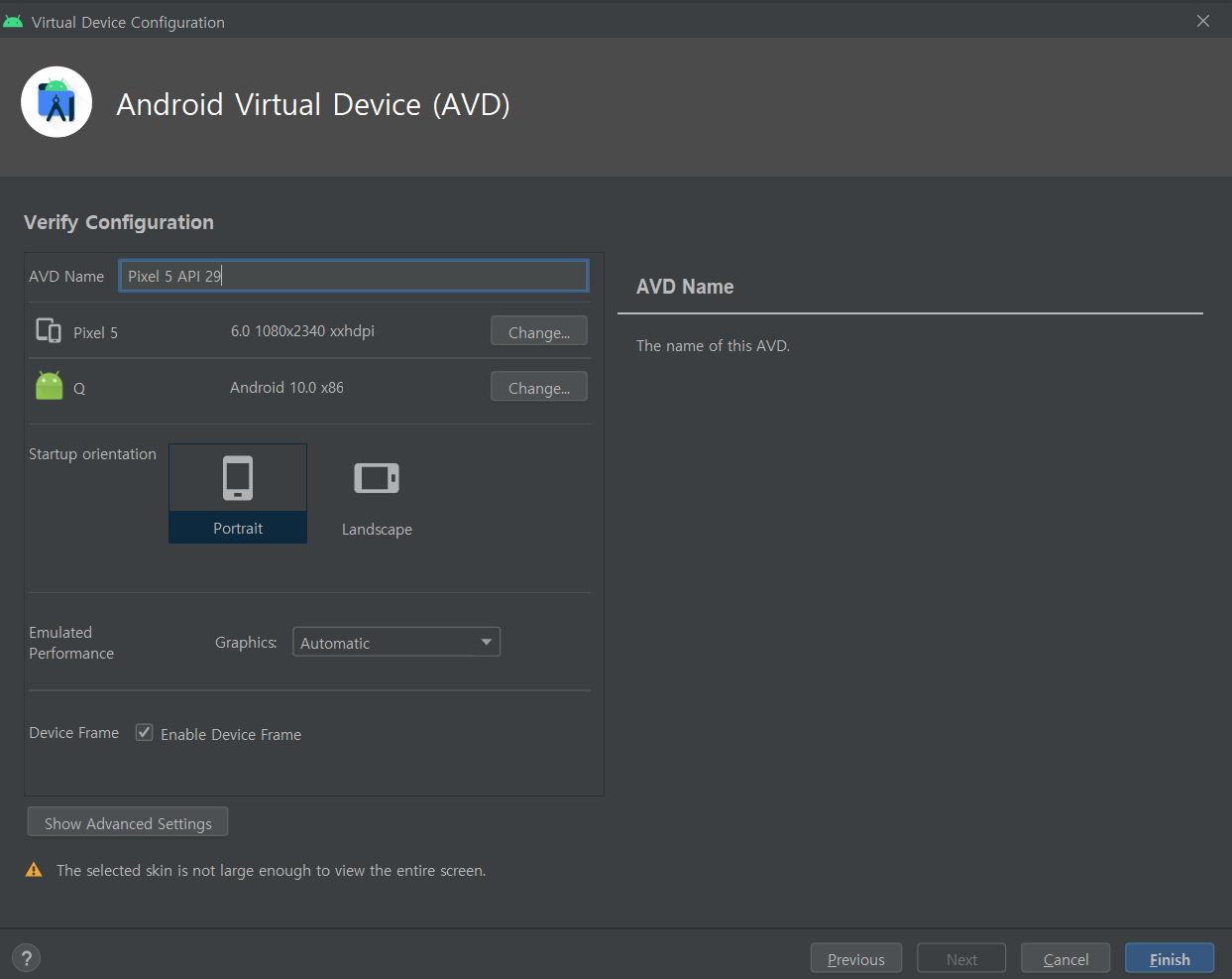 이제 AVD 명칭과 여러 가지 설정을 진행할 수 있습니다. 우선 디폴트 값으로 저장하고 완료하겠습니다.