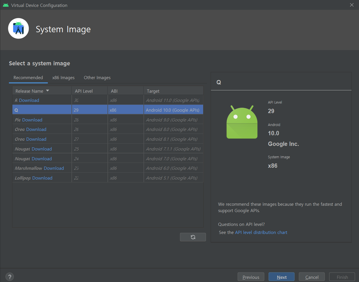 참고로 Recommended 탭이 아닌 x86 Images 탭에서는 하드웨어 가속을 사용하는 OS이미지, Other Images 탭에서는 하드웨어 가속을 사용하지 않는 이미지를 보여줍니다. 하드웨어 가속을 사용하지 않으면 너무 느리기 때문에 사실상 의미가 없으니 우선은 추천 이미지를 사용합니다.