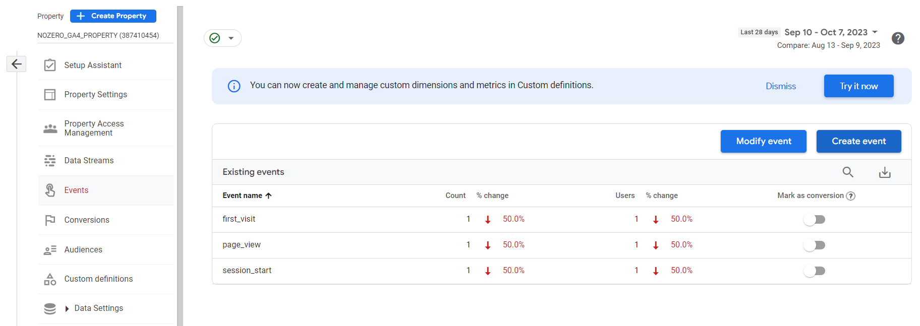 이제 24시간이 지나서 이벤트 리스트에 이 sign_up 이벤트가 노출되기 시작한다면, User attributes 등의 리포트 메뉴에서도 해당 이벤트 발생 건수 등을 확인할 수 있게 됩니다.