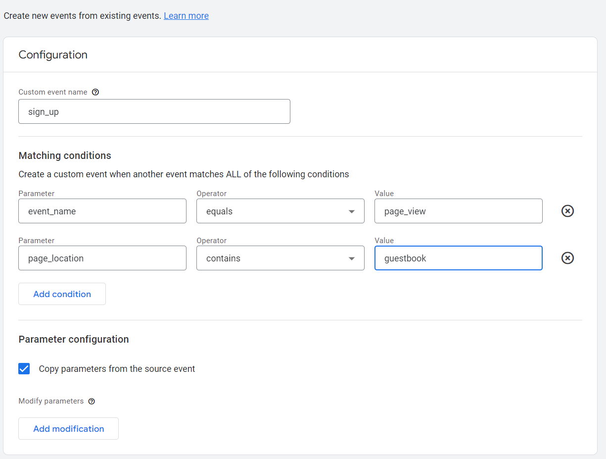 우선은 Custom event name을 설정해 보겠습니다. 일단 GA에서 추천하는 이벤트 명칭들이 존재하는데요, 우리는 '회원가입 완료'를 목적으로 하니 추천 이벤트 명인 sign_up으로 그대로 설정해 보겠습니다.