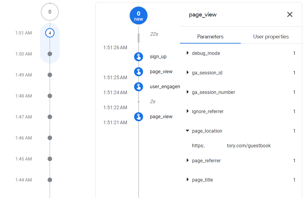 sign_up이란 이벤트가 발생한 것을 확인할 수 있습니다. page_view 이벤트가 발생했고 동시에 page_location에 guestbook이란 단어가 포함되었기 때문입니다.
