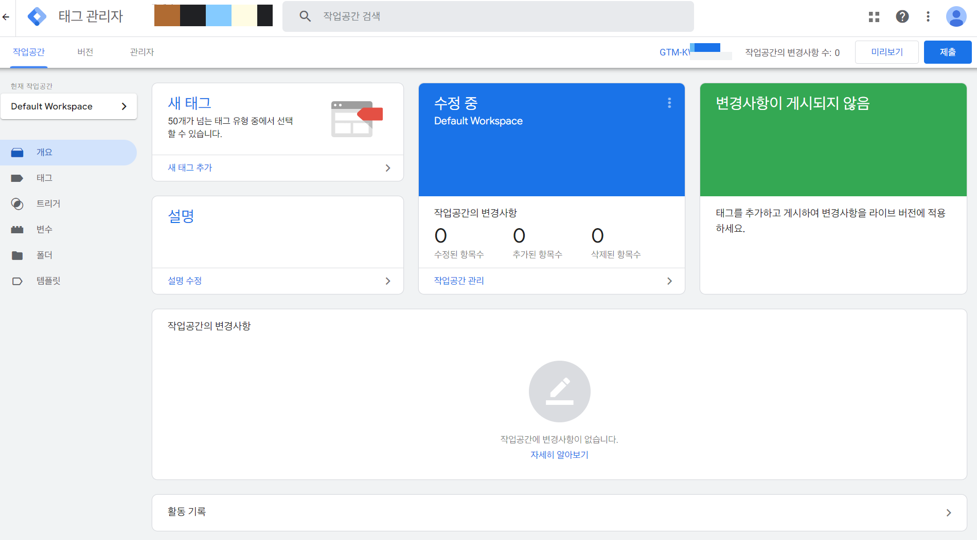 GTM 화면은 작업공간 / 버전 / 관리자로 크게 세 개의 탭 구분이 됩니다. [작업공간](워크스페이스)에서 대부분의 작업이 진행됩니다.