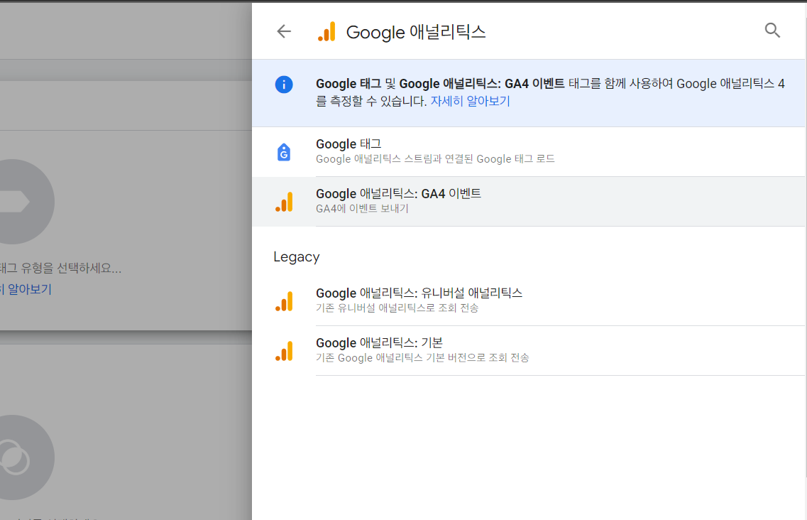 이제 '태그 구성'을 클릭합니다. 태그 유형 선택메뉴가 나오는데, 우리가 만일 가능하다면 [맞춤 HTML] 메뉴를 통해서 "데이터를 GA로 보내라"라고 코딩할 수 있겠습니다. 하지만 우리는 직접 코드를 짤 수 없으니, 여기서 [Google 애널리틱스] > [Google 애널리틱스: GA4 이벤트]를 클릭합니다. 이 클릭만을 통해서 "이벤트 데이터를 GA4로 보내라"라는 명렁어(태그)를 만들 수 있게 되는 것입니다!