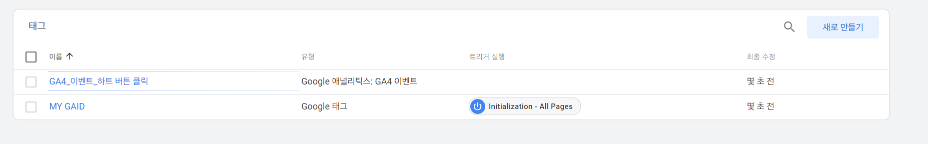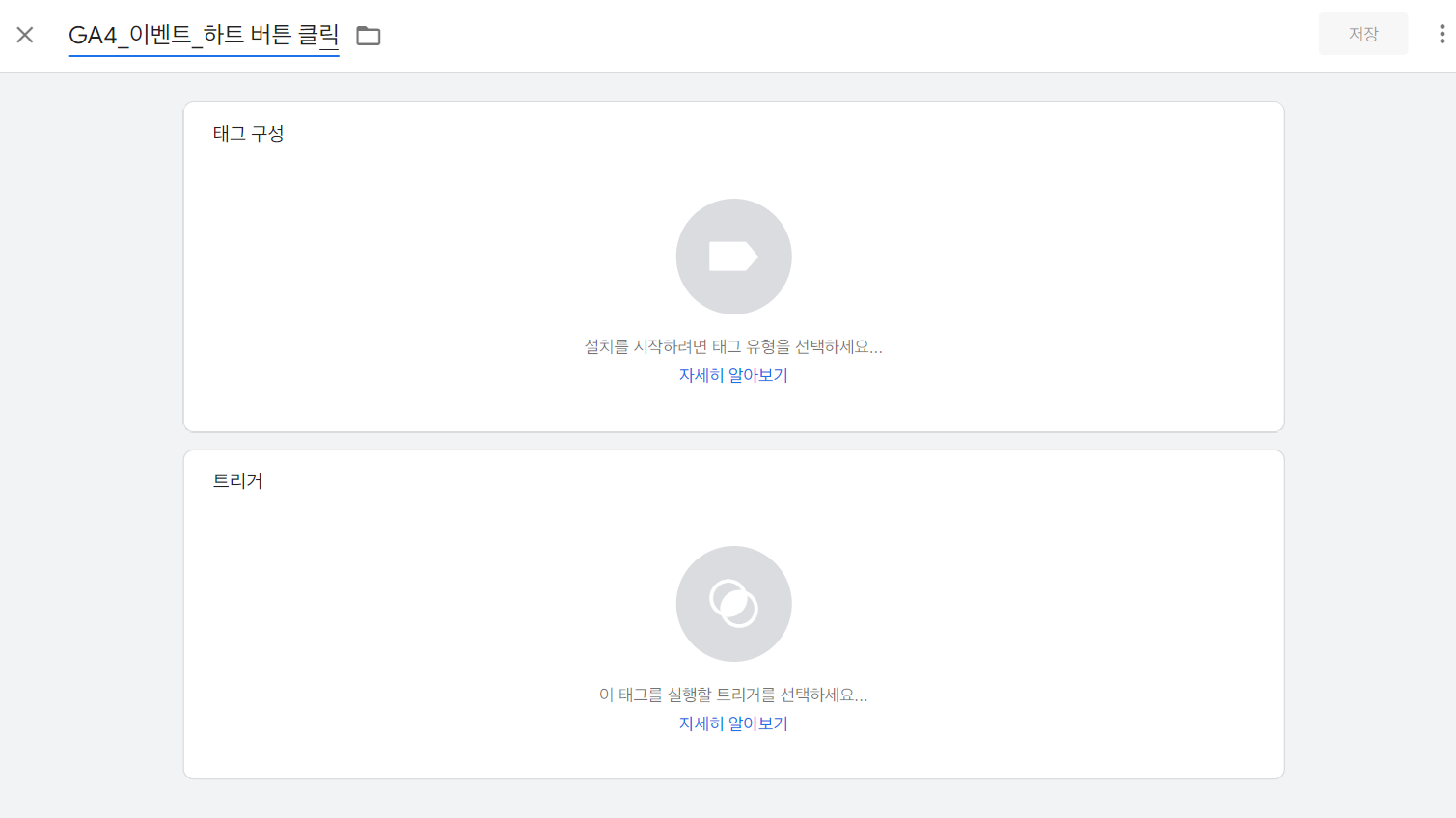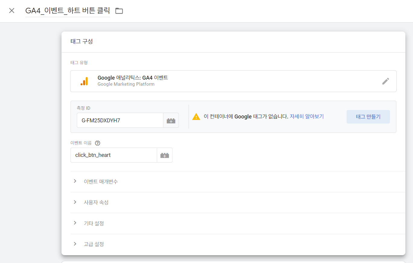 여기까지 값이 입력되었다면 "트리거가 발생하면(따로 설정) xxx...GA 계정으로 click_btn_heart라는 이름으로 GA4 이벤트를 쏴라"라는 명령이 설정된 것입니다.