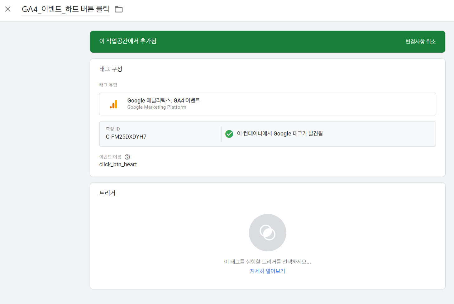 이제 아래와 같이 설정이 일차적으로 완료되었습니다. 이제 해당 클릭 이벤트에 대한 트리거만 설정하면 됩니다.