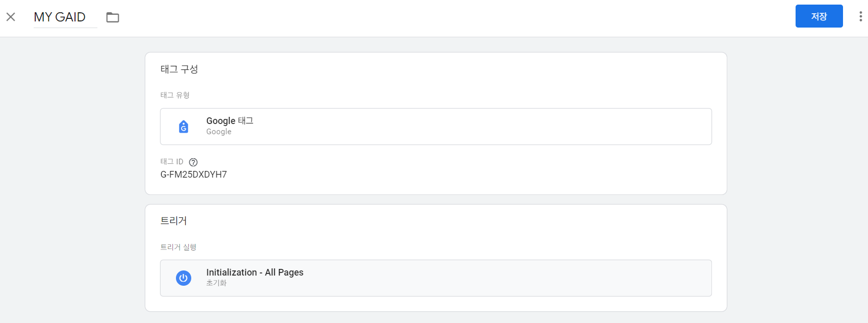현재 측정 ID 입력 시에 Google 태그가 없는 상태이므로, 해당 태그도 MY GAID라는 태그로 생성해 둡니다.