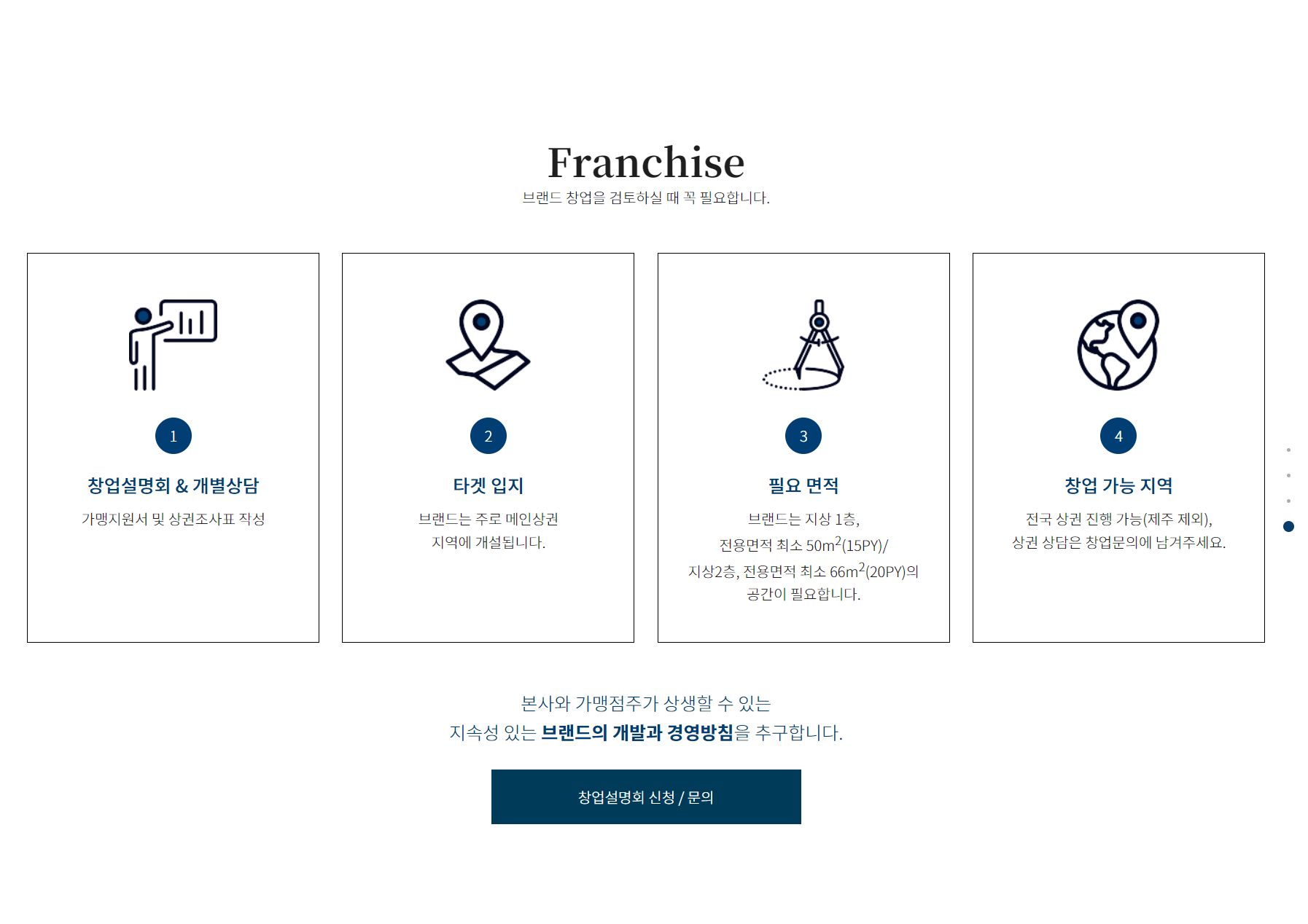 | 메인 페이지 4단 > [창업 문의 신청하기] 버튼을 얼마나 클릭하며, 어떤 탭에 배치된 버튼으로 클릭하는지? | ||