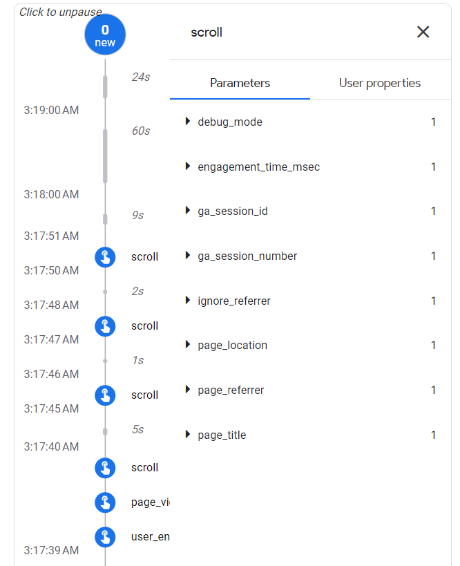 디버그 뷰에서 확인해 보았습니다. 아래와 같이 총 네 번의 [scroll] 이벤트가 감지되었음을 확인할 수 있습니다. 하지만 여기서 문제가 발생했습니다. [scroll]이 25~90%까지 총 네 번 발생하였지만, 어떤 이벤트가 몇 %의 비율에서 발생한 이벤트인지 구분이 되지 않습니다.
