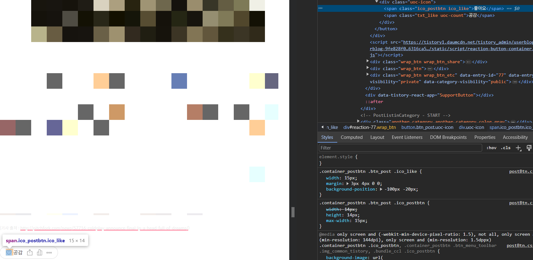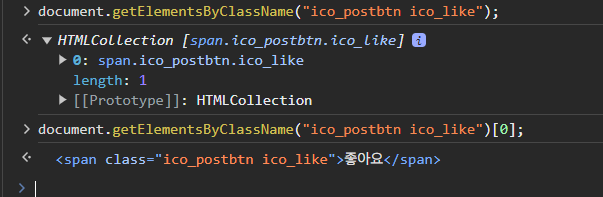 위의 하트모양 버튼 이미지의 클래스를 검색해 보니, ico_postbtn ico_like으로 확인됩니다. 콘솔에서 이를 활용해서 입력해 보겠습니다. 클래스이므로, 인덱스 넘버를 붙이지 않은 경우와 붙인 경우를 모두 알아보겠습니다.