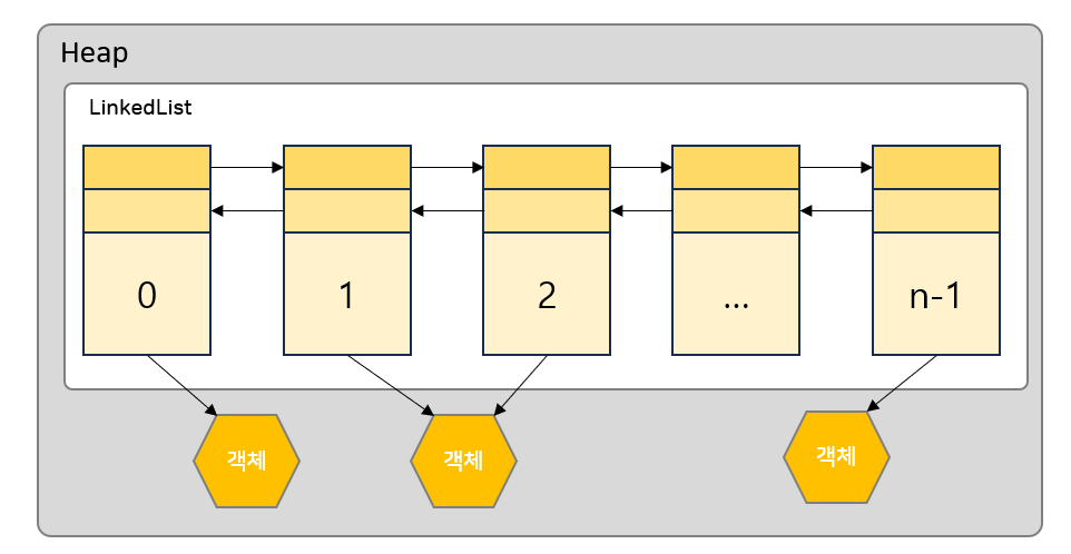 하지만 LinkedList의 경우는 아래 그림과 같은 형태로 관리됩니다.