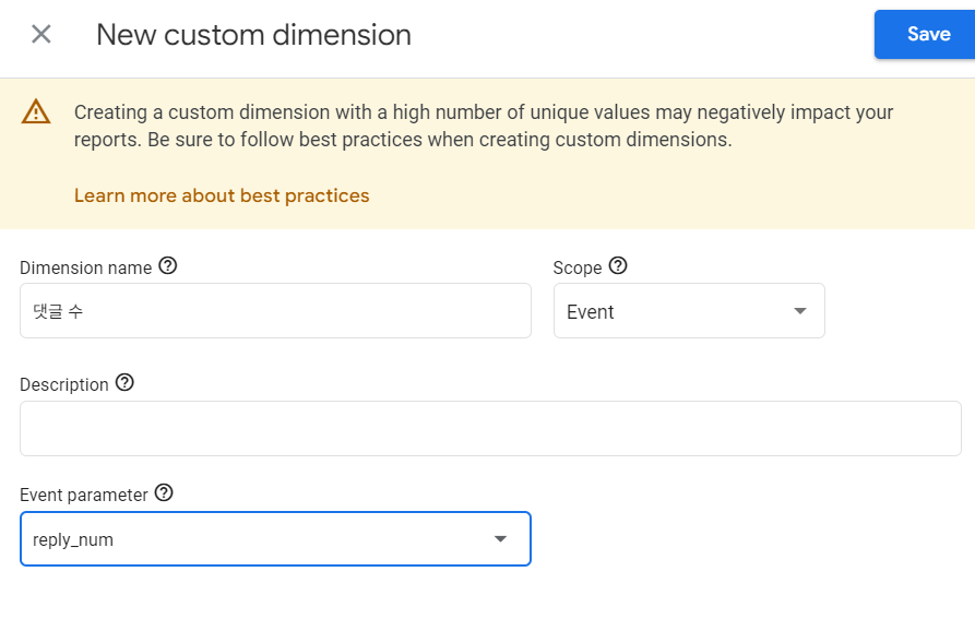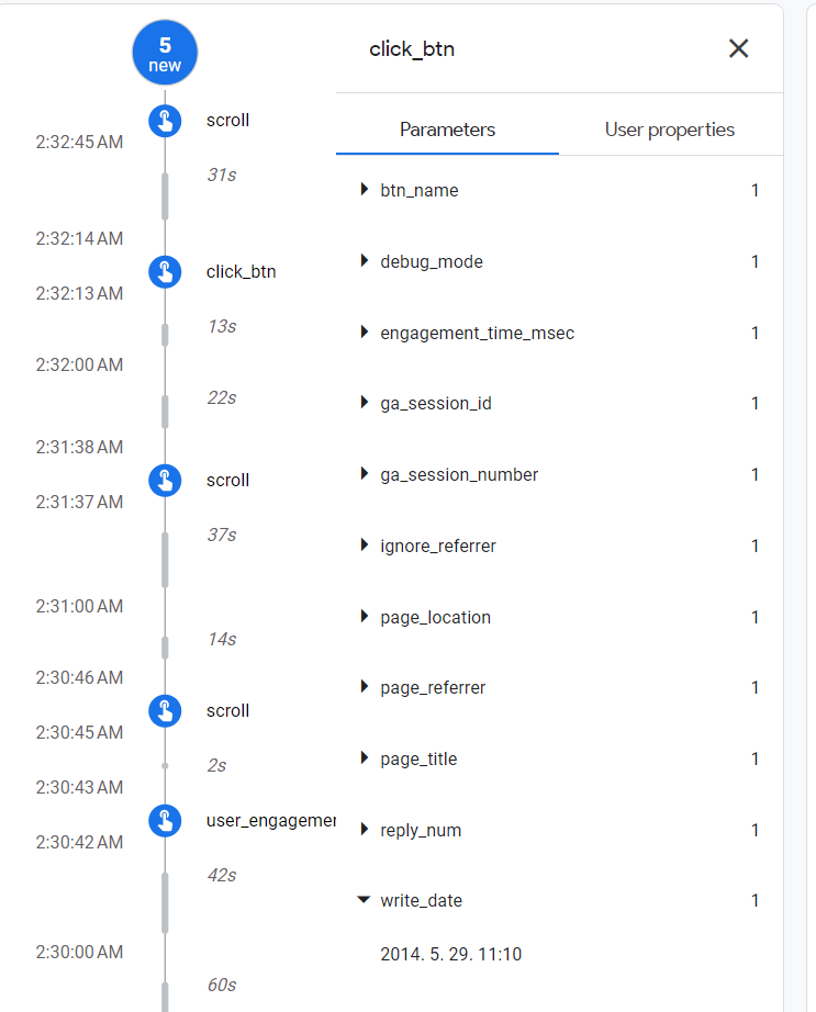 그런데 우리는 여기에 몇 가지 추가 정보를 얻기 위해 파라미터를 추가하고자 합니다. 바로 해당 클릭이 일어난 글의 "댓글 수", 그리고 "글 작성일자"죠. 이 두 가지 파라미터를 각각 reply_num과 write_date라고 가정하고, 해당 이벤트 파라미터를 추가해 보도록 하겠습니다.