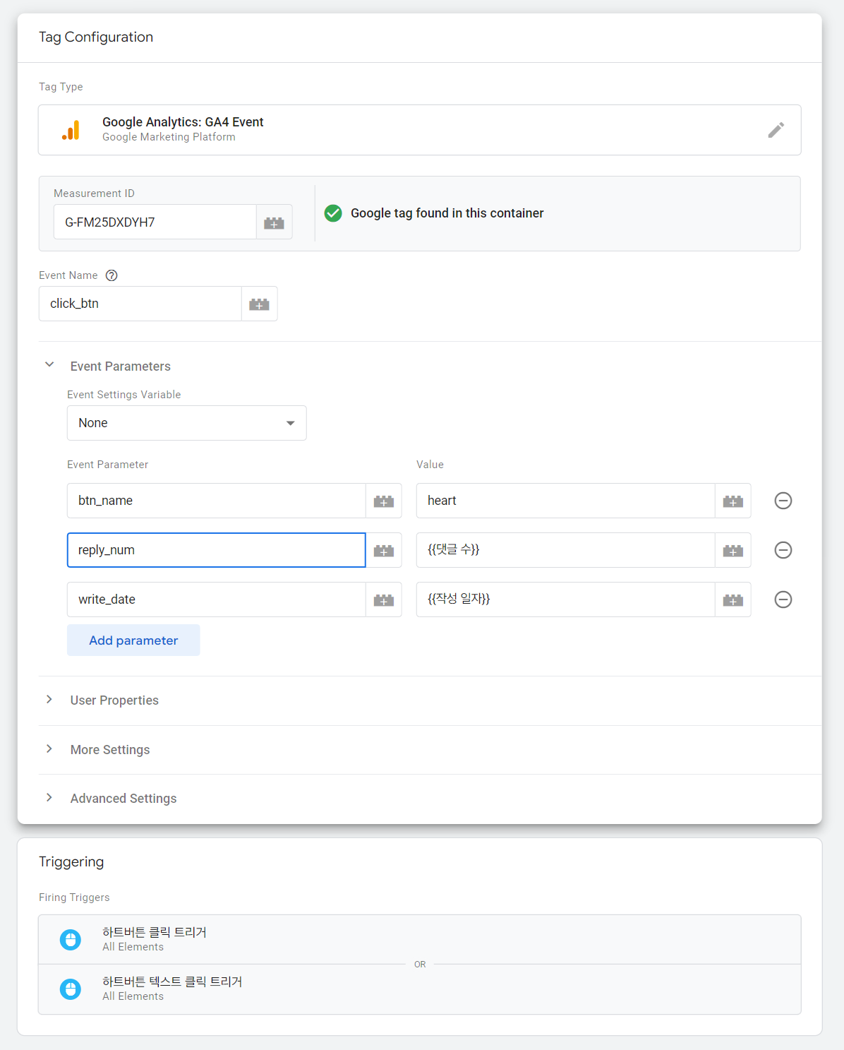 이제 [click_btn] 이벤트의 파라미터를 추가합니다. parameter name은 각각 [author] / [write_date]로 정의합니다. 다만, 기존 파라미터와 다른 점은 value에서 우리가 생성한 [작성자]와 [작성 일자]를 선택해 적용한다는 점입니다.